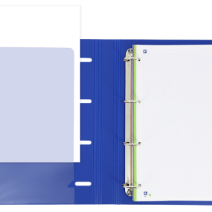 El logo A4 aparece discreto pero firme en la esquina inferior, con esas líneas horizontales que le dan un toque moderno sin quitarle protagonismo al color principal. Las argollas metálicas (plateadas y robustas) contrastan con frialdad profesional contra el azul intenso, la goma elástica azul oscuro cierra con un snap seguro y sin holguras (ideal para que nada se escape cuando corres al aula), y al abrirlo, el interior azul marino con esa hoja blanca o cuadriculada de fondo te da una sensación de orden y amplitud – perfecto para apuntes limpios, esquemas detallados y cero caos visual.