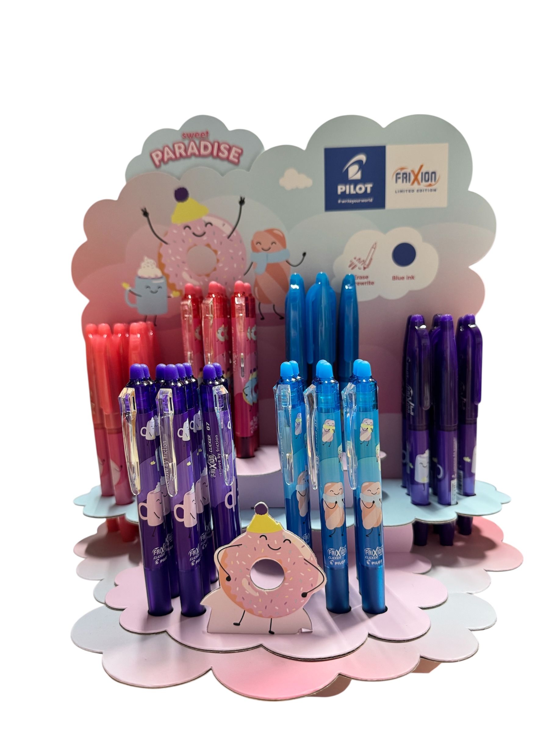 El expositor incluye una variedad de colores vibrantes (azul turquesa, morado, rosa coral, rojo, azul intenso y más), con tinta borrable termo-sensible FriXion de 0.7 mm (clic para retractar, borrador integrado que elimina todo sin dejar rastro). Perfecto para escribir sin errores, repasar exámenes o simplemente disfrutar escribiendo con estilo. El diseño del stand es en cartón resistente con formas de nubes, donuts y personajes recortados que lo hacen un objeto decorativo precioso por sí solo – ideal para tiendas, regalos o para exponer en casa/oficina.