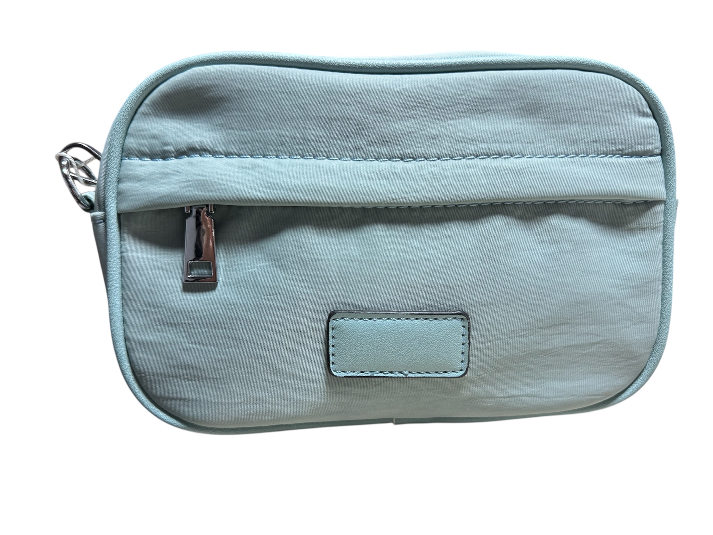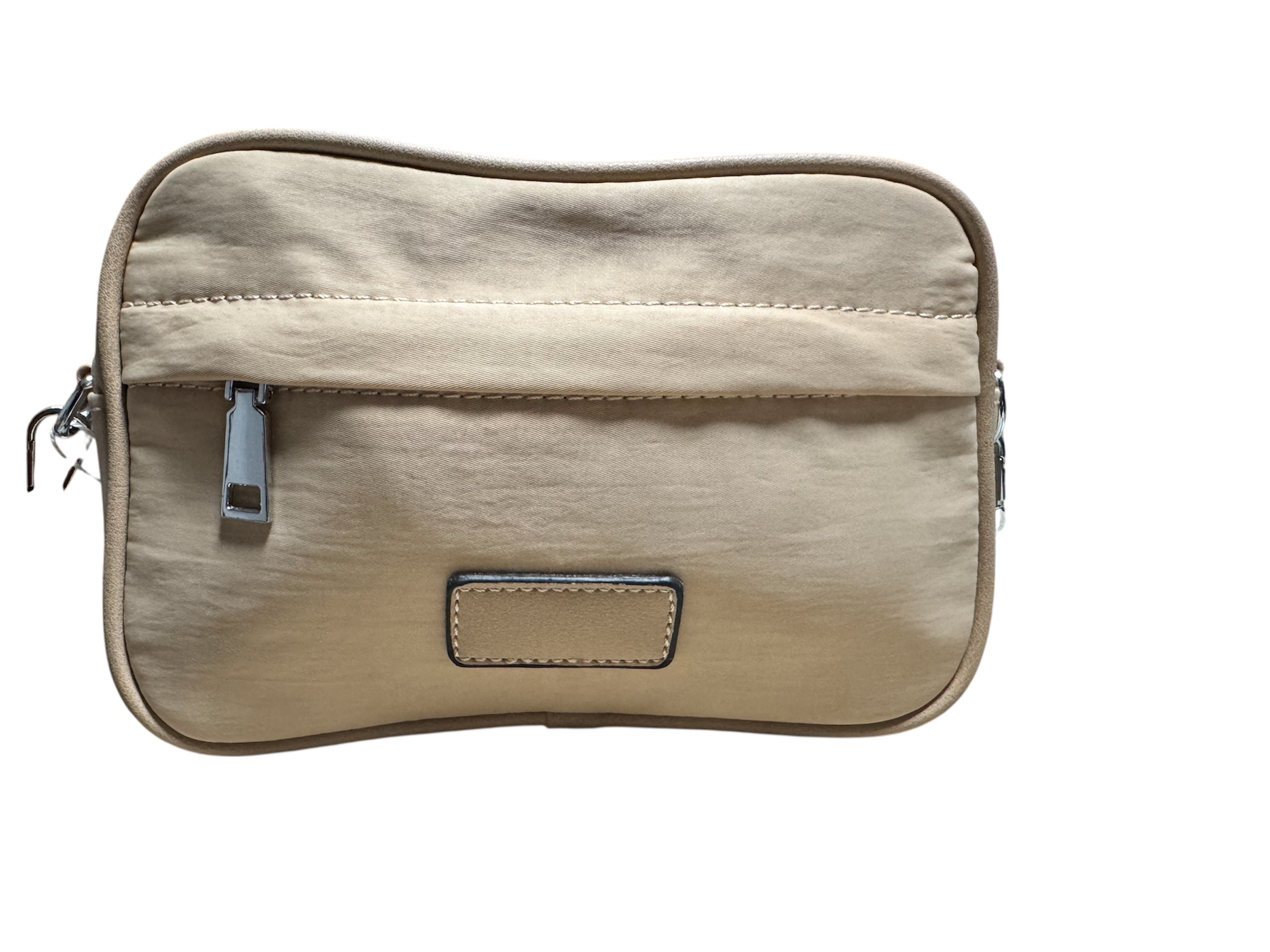 Riñonera o belt bag en nylon técnico de alta calidad, material ligero, resistente al agua y con acabado satinado sutil que le da un toque premium y moderno. Disponible en dos colores neutros y fáciles de combinar: beige arena (elegante y minimalista, ideal para todo el año) y menta/verde agua claro (fresco, primaveral y con vibe trendy para 2026). El diseño es acolchado suave en los bordes para mayor comodidad, con cremallera superior segura (fácil acceso rápido), bolsillo frontal con placa rectangular en piel o símil cosida (detalle sofisticado que eleva el look), y herrajes metálicos plateados resistentes.
