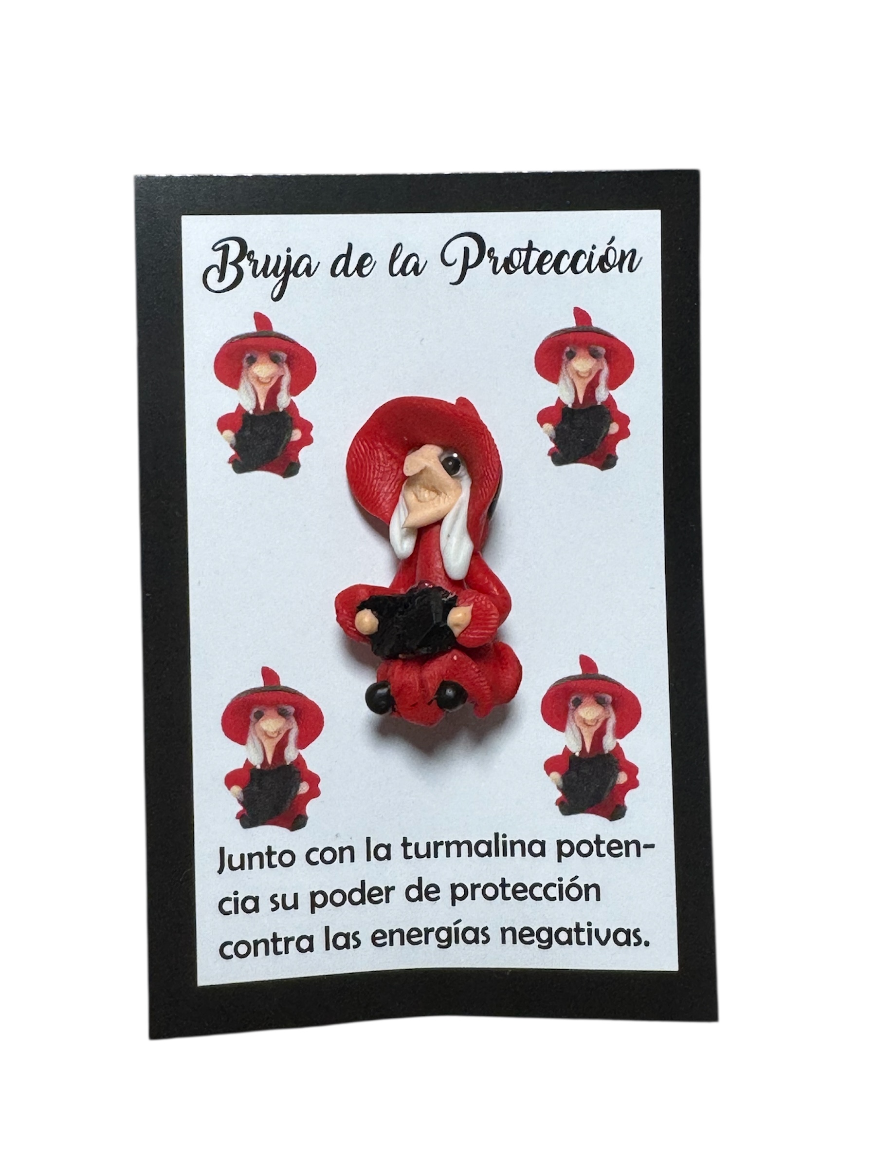 Montada sobre una elegante tarjeta negra con detalles en blanco, lleva el título “Bruja de la Protección” y el mensaje: “Junto con la turmalina potencia su poder de protección contra las energías negativas.”