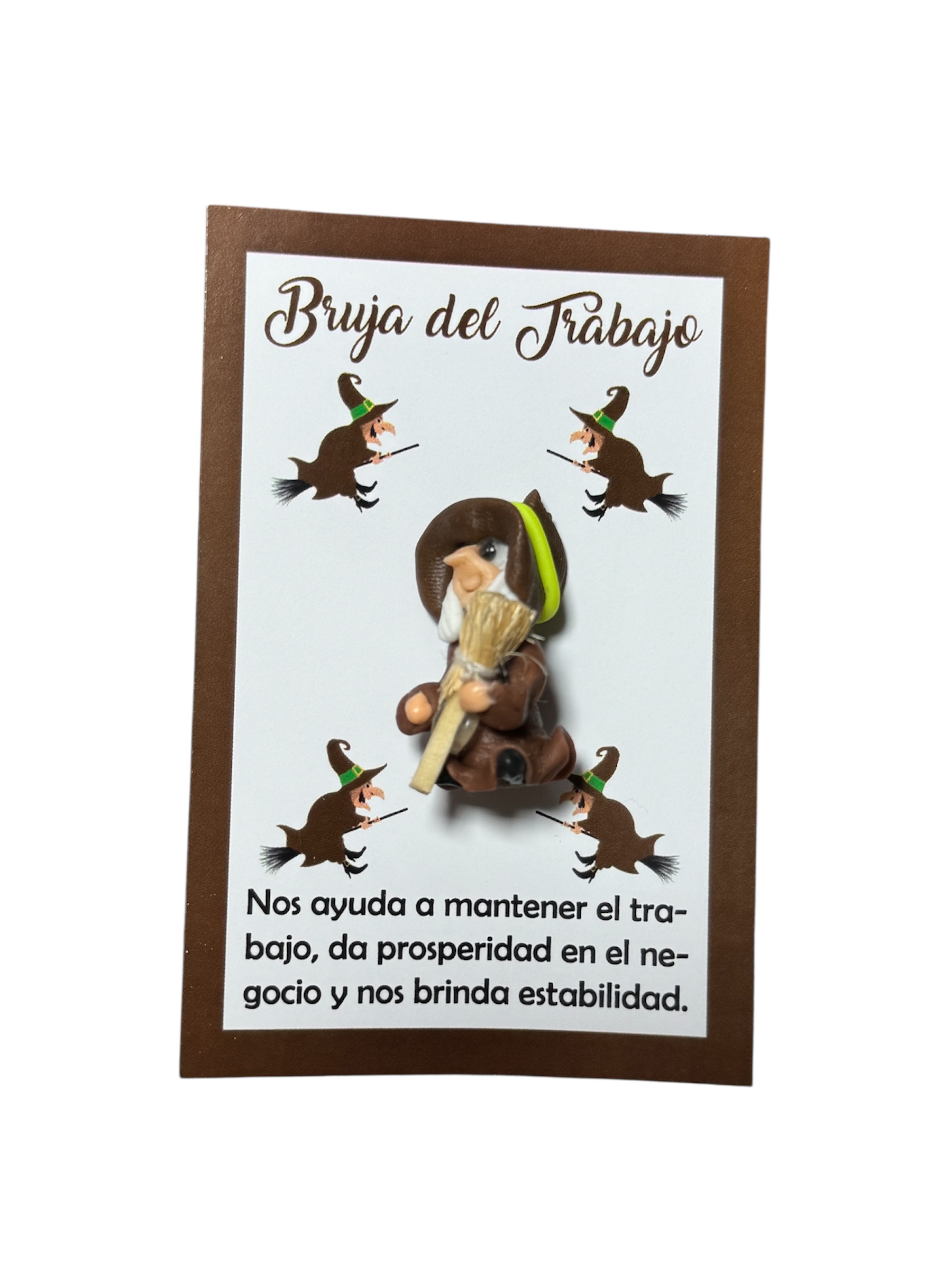 Montada sobre una elegante tarjeta marrón con detalles en blanco, lleva el título “Bruja del Trabajo” y el mensaje: “Nos ayuda a mantener el trabajo, da prosperidad en el negocio y nos brinda estabilidad.”