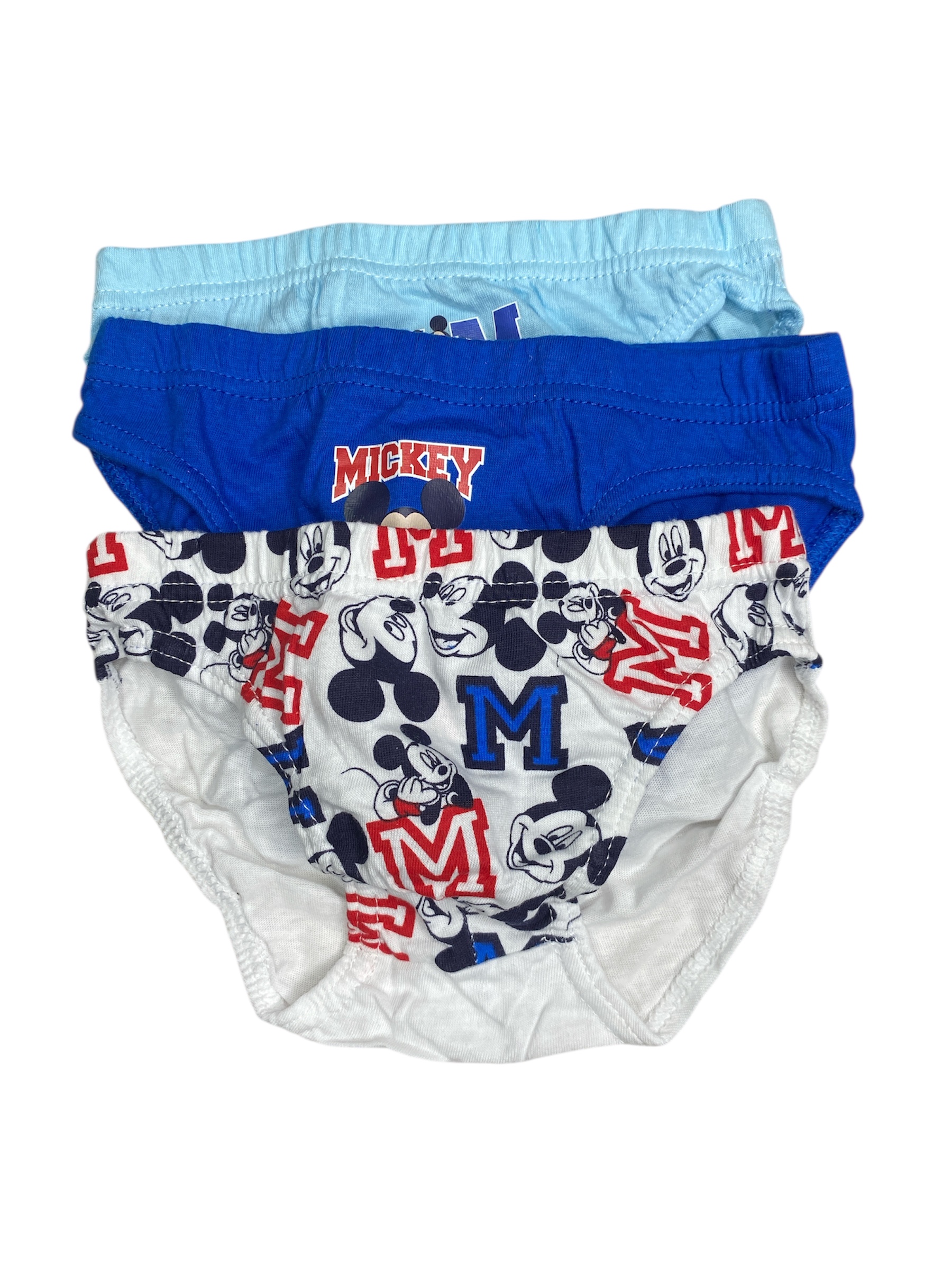 Los diseños son superdivertidos: uno azul intenso con el nombre «MICKEY» y orejas en relieve, otro blanco con un all-over print de Mickey en diferentes poses, gafas y letras grandes en rojo y azul, y un tercero en celeste suave con detalles sutiles. La cintura elástica ancha en colores coordinados asegura un ajuste perfecto sin marcas, mientras los estampados vibrantes resisten lavados sin perder color.