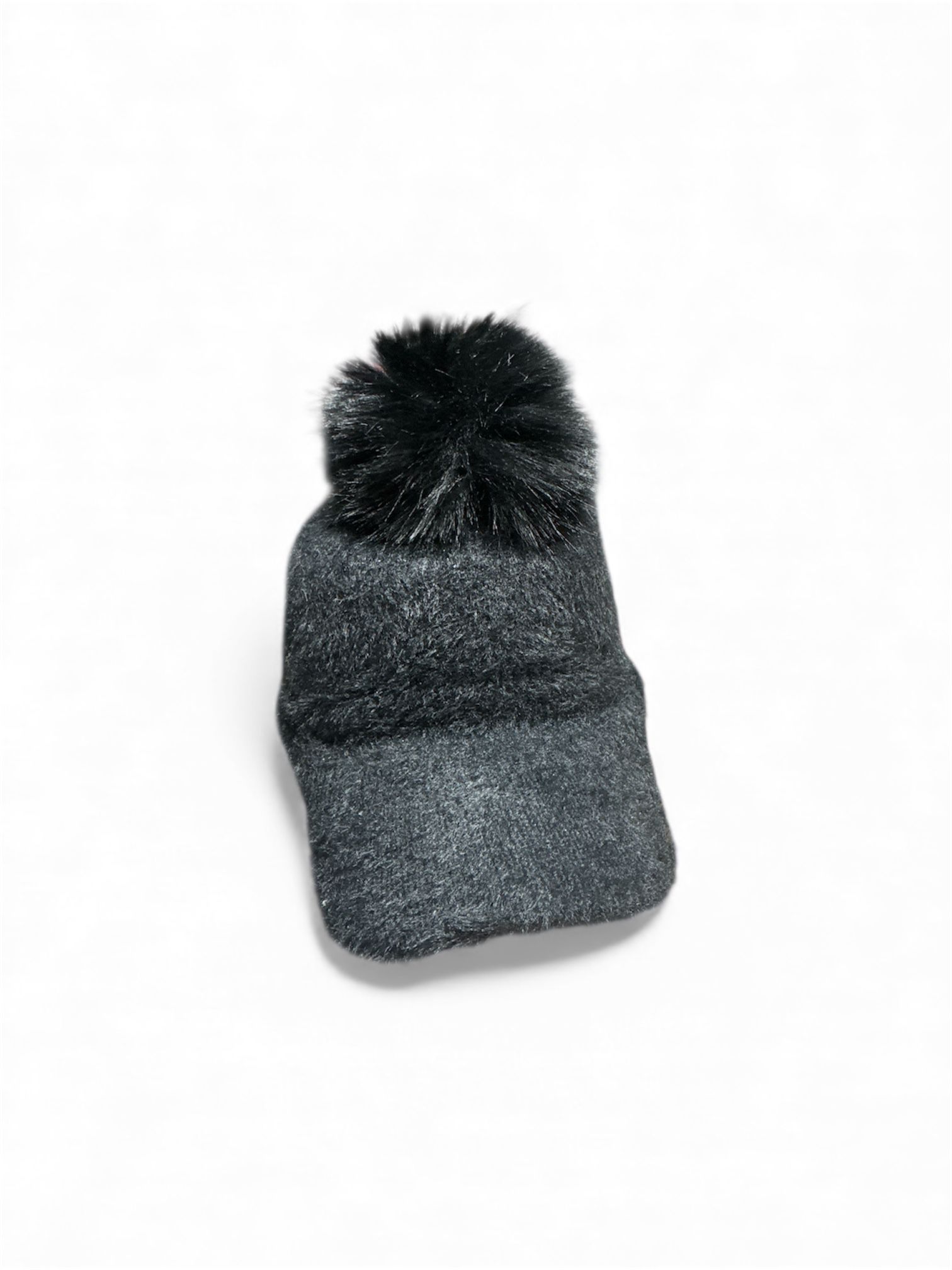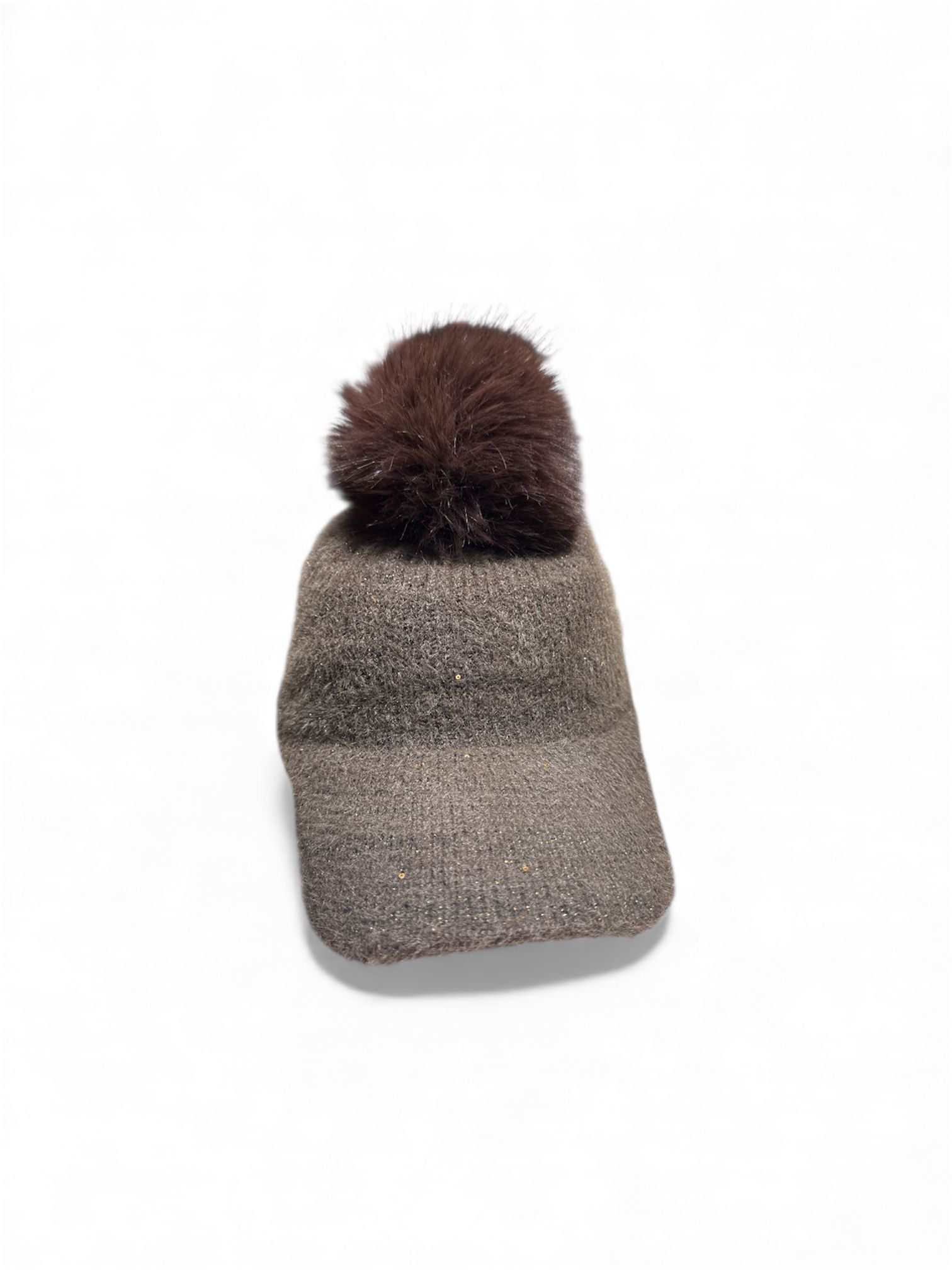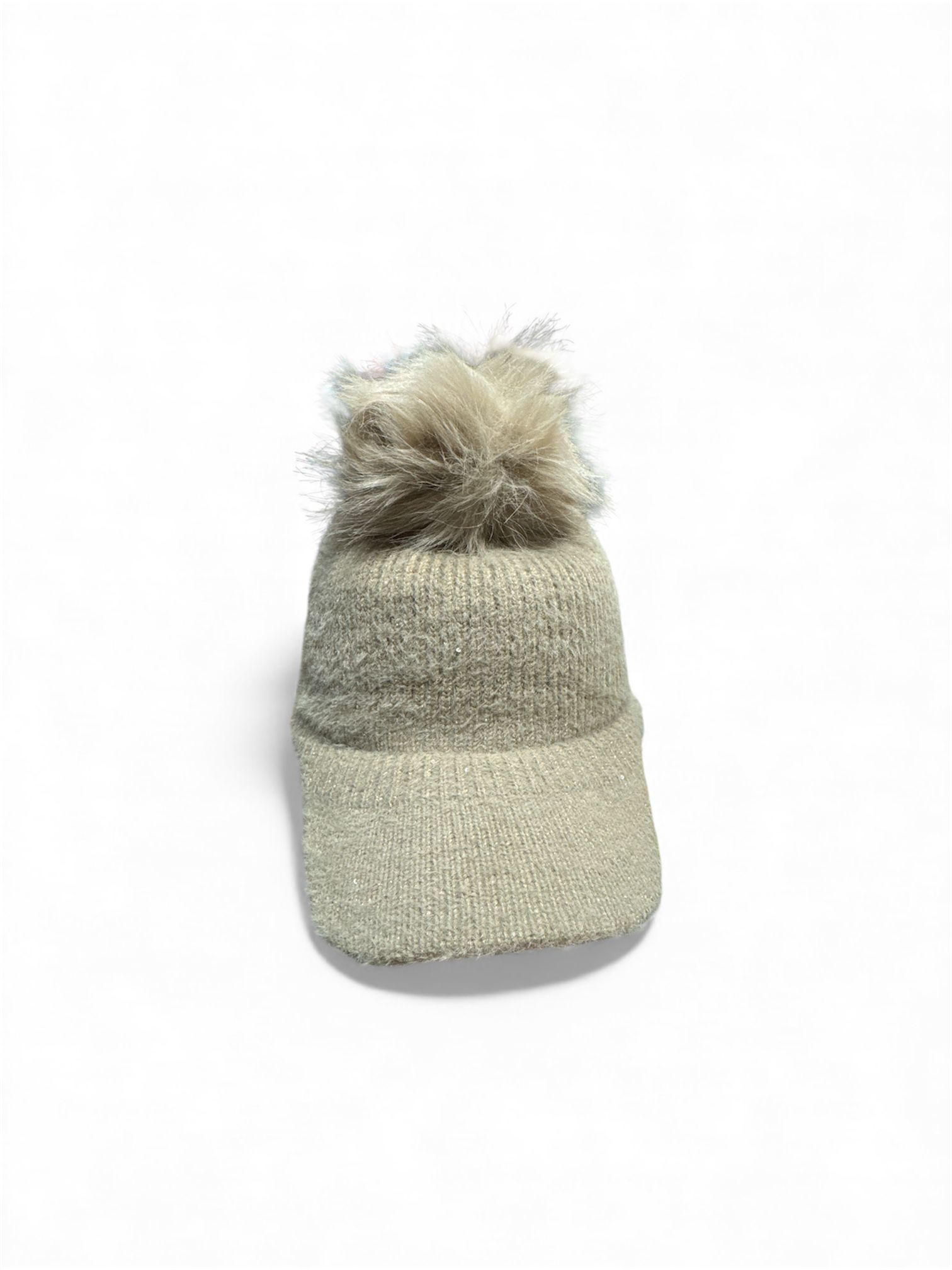 Gorro tejido con visera y pompón suave, ideal para mantener el abrigo con un toque moderno y funcional.