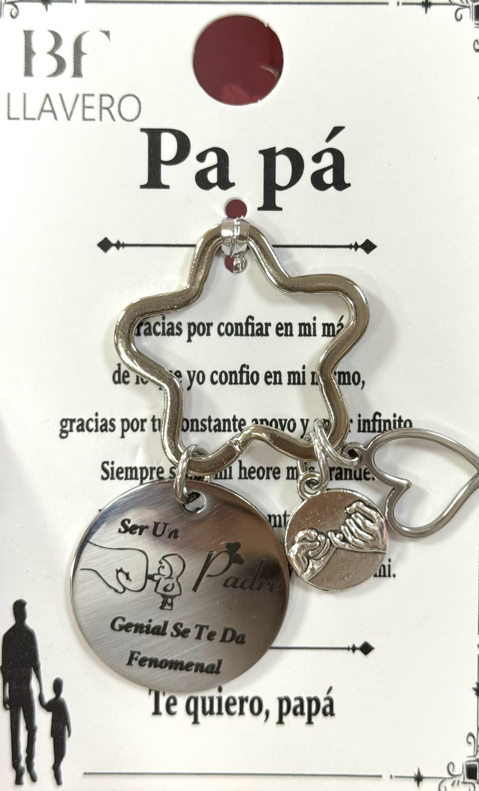 Viene montado en una tarjeta hermosa con diseño decorativo, silueta de padre e hijo/a caminando de la mano, y un texto emotivo impreso que dice cosas como: «Gracias por confiar en mí más de lo que yo confío en mí mismo… Gracias por tu constante apoyo y amor infinito… Siempre serás mi héroe más grande… Te quiero, papá».