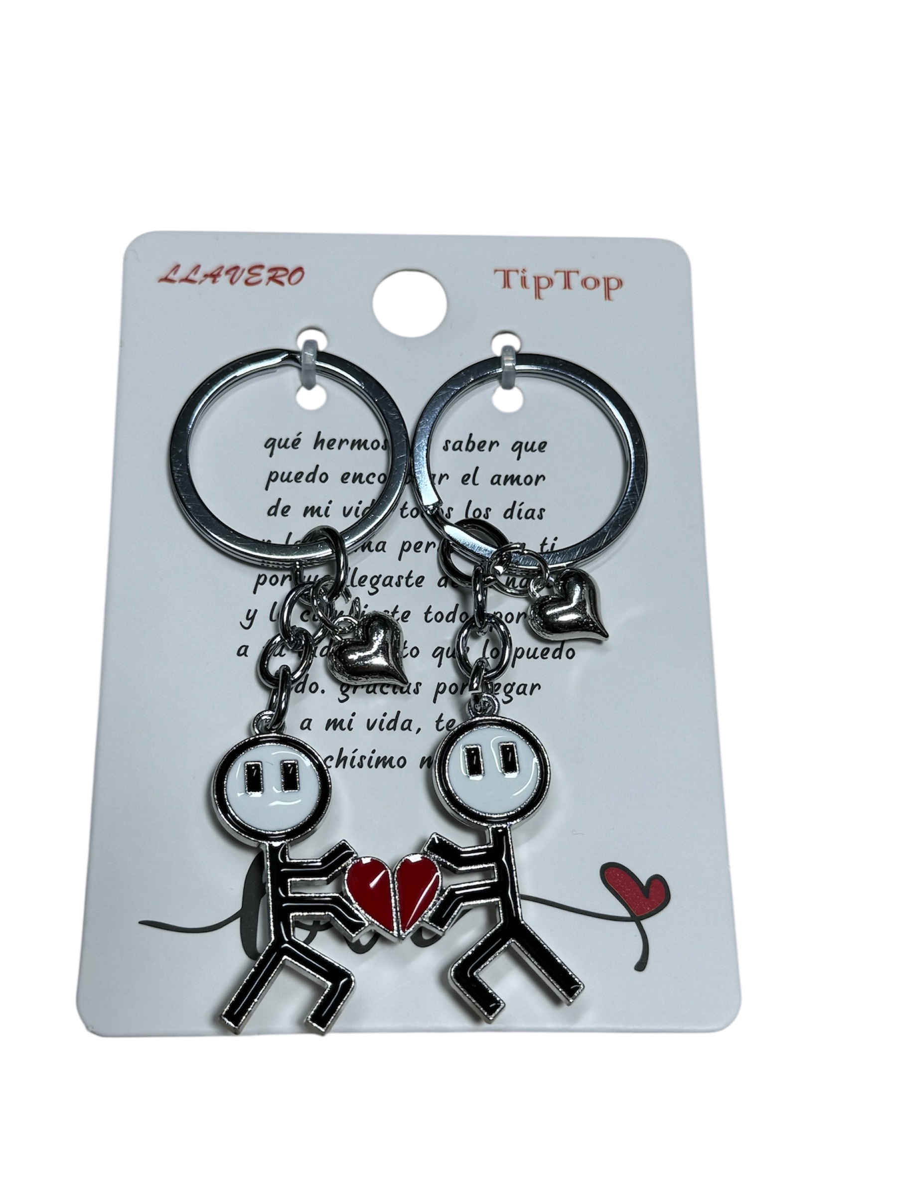 Hermoso y original set de llaveros para pareja, fabricado en metal resistente, con un diseño creativo de dos figuras que se complementan al juntarse formando un corazón rojo partido en dos. Cada llavero incluye detalles metálicos en forma de corazón que realzan su estilo romántico y moderno.