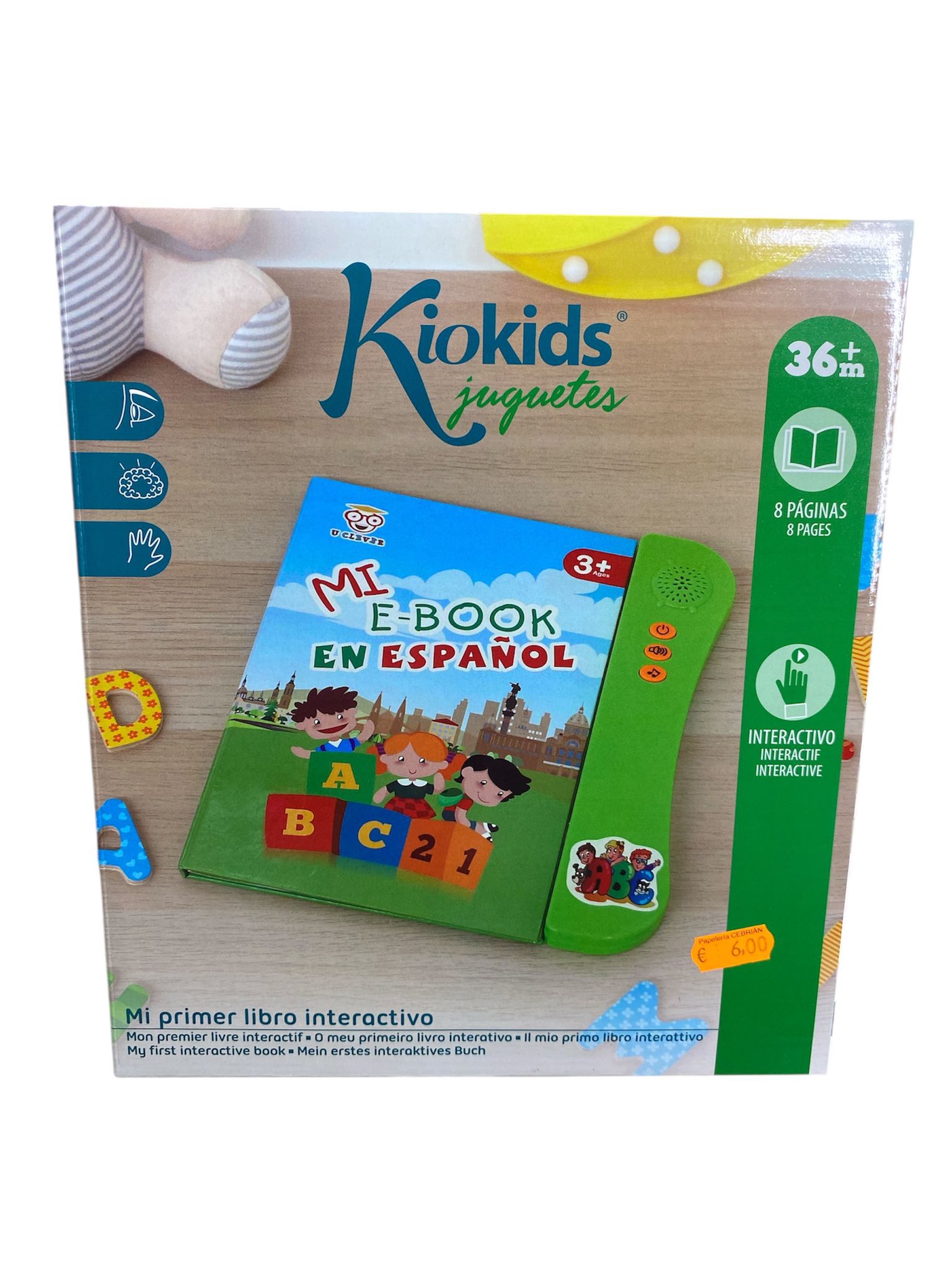 El producto mostrado en la imagen es el «Mi Primer Libro Interactivo» o «Mi E-Book en Español» de la marca KioKids, una empresa especializada en juguetes educativos y productos de puericultura para los más pequeños. Se trata de un libro táctil interactivo diseñado especialmente para niños a partir de los 36 meses (3 años), como indica el icono «36+ m» y «3+» en la caja. Es un juguete electrónico que combina el formato tradicional de un libro con tecnología sonora, ideal para introducir a los niños en el aprendizaje del español de forma lúdica y autónoma.