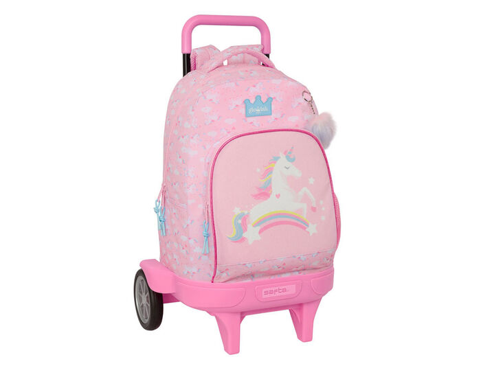 Esta mochila trolley con ruedas de Glowlab Kids (marca de Safta) en rosa pastel es el sueño de cualquier pequeña princesa unicornio. El estampado all-over con nubes suaves, estrellitas brillantes y toques arcoíris crea un ambiente de cuento de hadas, mientras el frontal destaca con un unicornio blanco precioso con crin multicolor, cuerno brillante, ojos cerrados en paz y un corazón rosado, todo enmarcado en un panel curvo con bordes rosados brillantes y detalles glitter que captan la luz.