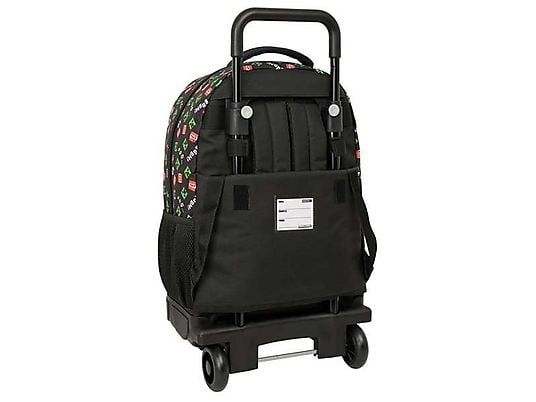 ¡Prepárate para una explosión de estilo con esta mochila con ruedas oficial Minecraft Creeper de Safta! Diseñada para los verdaderos miners y builders que no quieren cargar peso, esta trolley escolar trae la cara más icónica (y peligrosa) del juego en primer plano: el Creeper verde pixelado con expresión clásica y ojos negros, enmarcado en un panel marrón que simula bloques, y el logo «MINECRAFT» en verde brillante debajo. El estampado all-over en negro es puro caos divertido: bloques Creeper, TNT rojo, explosiones «BOOM!» y sonidos «SSS…» que hacen que cada paso sea una aventura épica.
