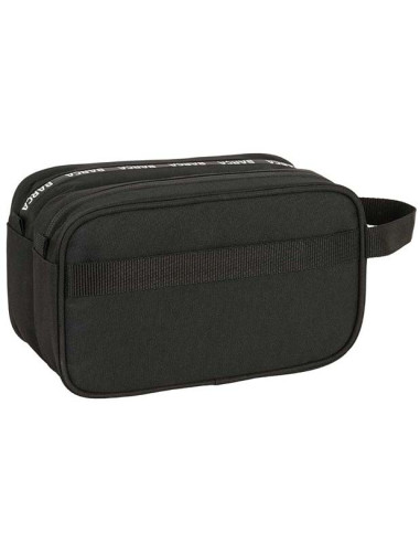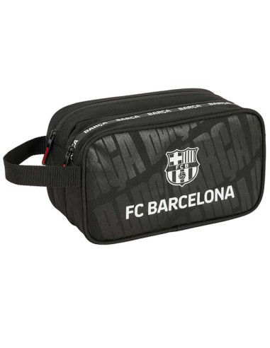¡Organiza tu día a día con estilo blaugrana gracias a este neceser oficial FC Barcelona negro con doble cremallera! Perfecto para el culé que valora la funcionalidad y el diseño elegante, este bolso de aseo combina un fondo negro intenso con un estampado sutil y potente de «BARÇA» repetido en tonos gris oscuro, creando un efecto dinámico y texturizado que resalta sin exagerar.