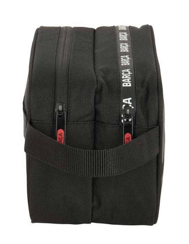 En el centro domina el escudo oficial del FC Barcelona en relieve o alto contraste (con la cruz de San Jorge, franjas blaugranas y balón), acompañado del texto «FC BARCELONA» en letras grandes y blancas en la parte inferior. Cuenta con doble cremallera principal (una por compartimento) con tiradores reforzados (detalle rojo sutil en algunos modelos), lo que permite separar perfectamente productos de aseo, cosméticos, accesorios de viaje, medicinas o incluso ropa interior pequeña. Incluye un asa lateral corta y resistente para llevarlo cómodo en la mano o colgado de la mochila/maleta.
