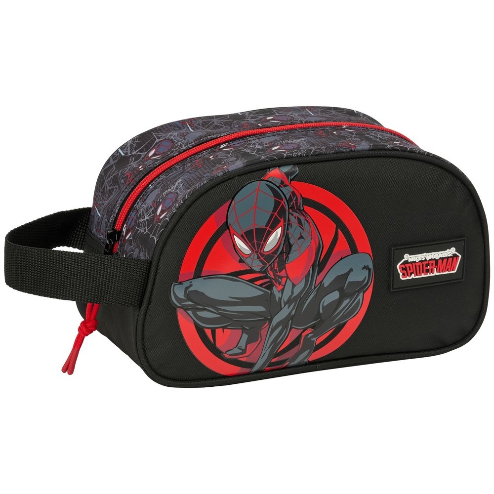 ¡Lanza tus aventuras diarias con este estuche/portatodo oficial de Spider-Man en negro intenso y épico! El diseño destaca a Spider-Man (en su versión moderna inspirada en Miles Morales) en plena acción acrobática dentro de un círculo rojo icónico de telarañas, con ojos blancos brillantes y pose poderosa. El fondo negro combina patrones de telarañas grises y toques rojos para un look oscuro y heroico, rematado con el parche textil elevado «Superhéroes Spider-Man» que añade relieve y estilo premium. La cremallera roja vibrante, el asa de transporte negra con detalle rojo y los bordes contrastantes hacen que sea un accesorio que grita poder y velocidad.