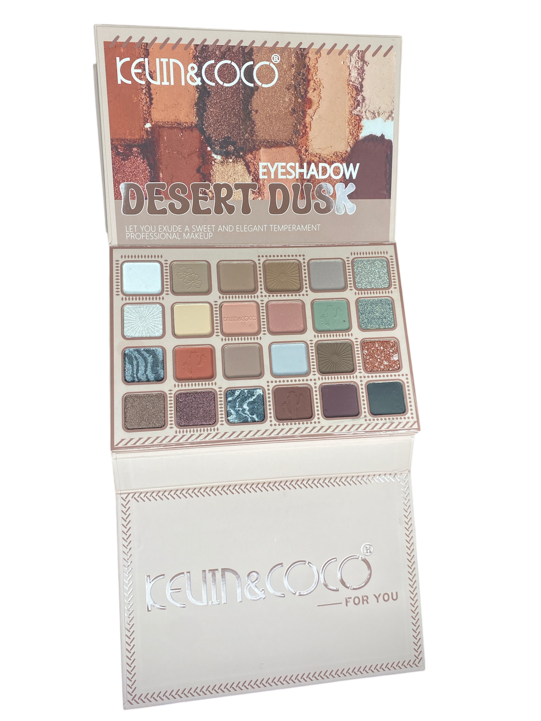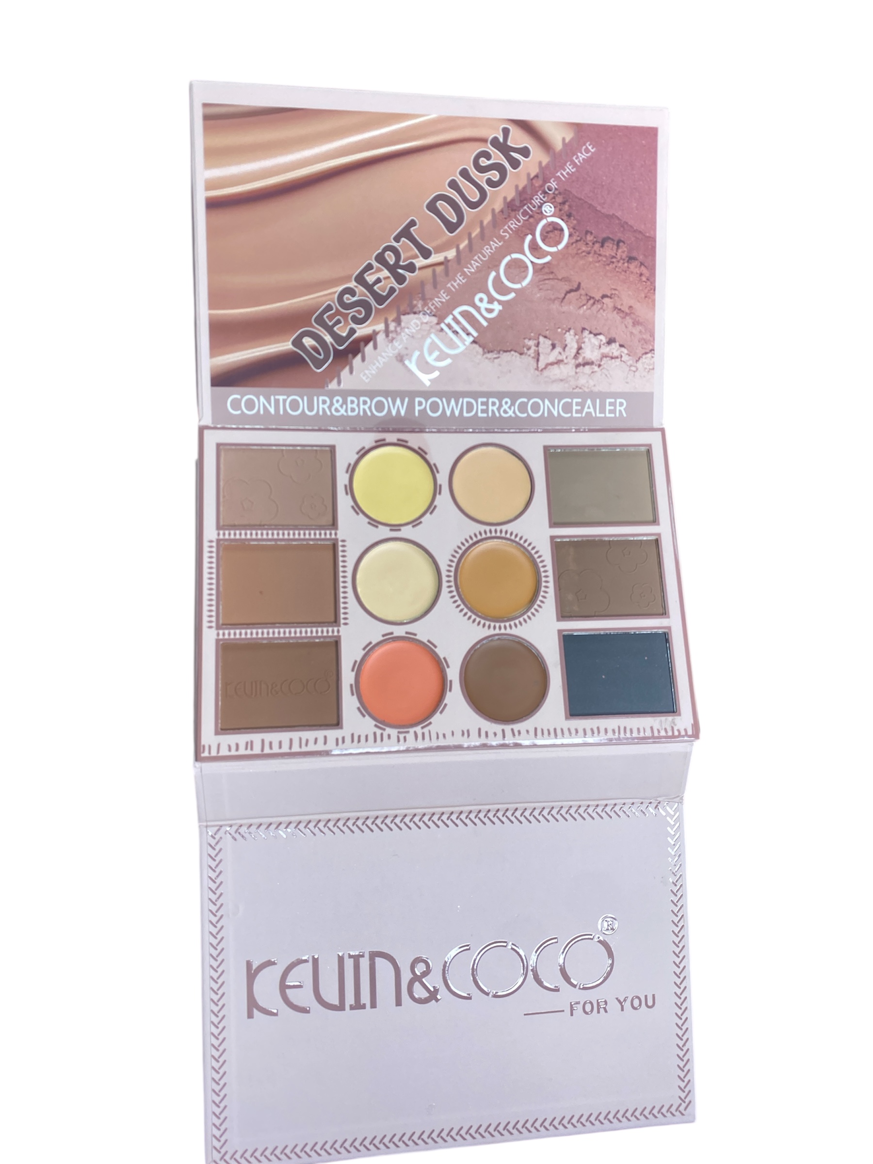 «Set Desert Dusk Kevin & Coco – Colección inspirada en el atardecer del desierto. Incluye paleta de 18 sombras, blush & highlighter, y contour & concealer. Tonos cálidos tierra, dorados y rosados para looks glowy y naturales. ¡Elegancia profesional y tendencia en un solo pack!»