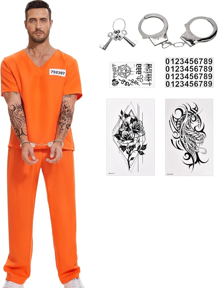 ¡Entra en el juego del delito con este disfraz de preso irresistible! Ideal para transformar cualquier fiesta en un «arresto caliente». El mono naranja clásico de prisión, combinado con esposas reales (de juguete) y tatuajes temporales que duran horas, te convierte en el recluso más deseado del bloque. Perfecto para Halloween, carnavales, fiestas de disfraces «prisión» o «policía y ladrón», sesiones de fotos spicy o noches de roleplay en pareja.
