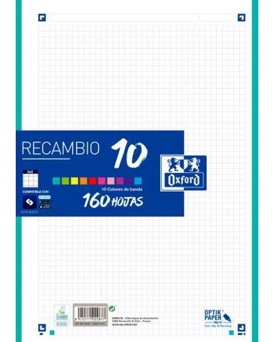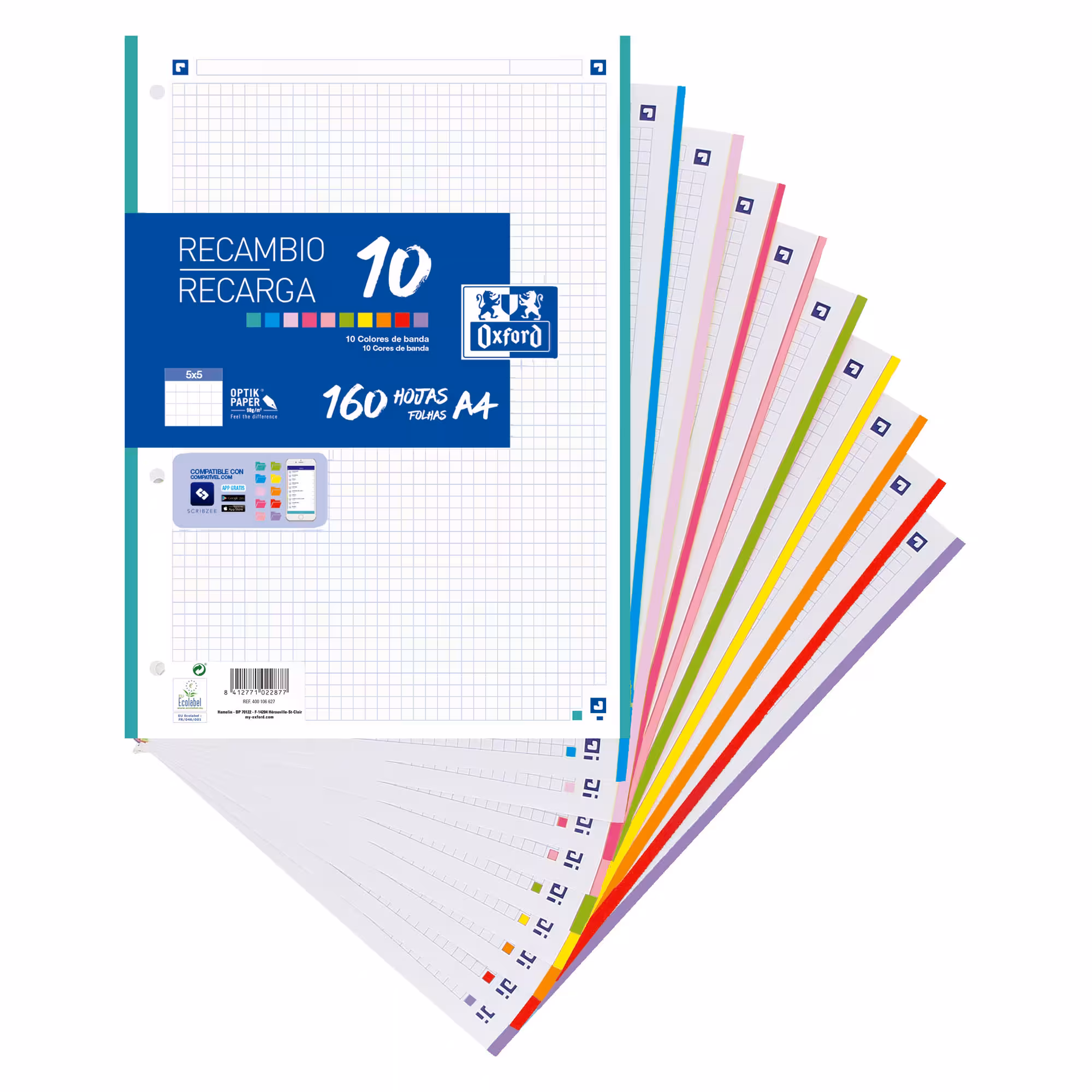 Recambio Oxford A4 de 160 hojas con cuadrícula 4×4 mm y 10 colores de banda. Papel Optik Paper de alta calidad, ideal para estudiar y organizar apuntes.