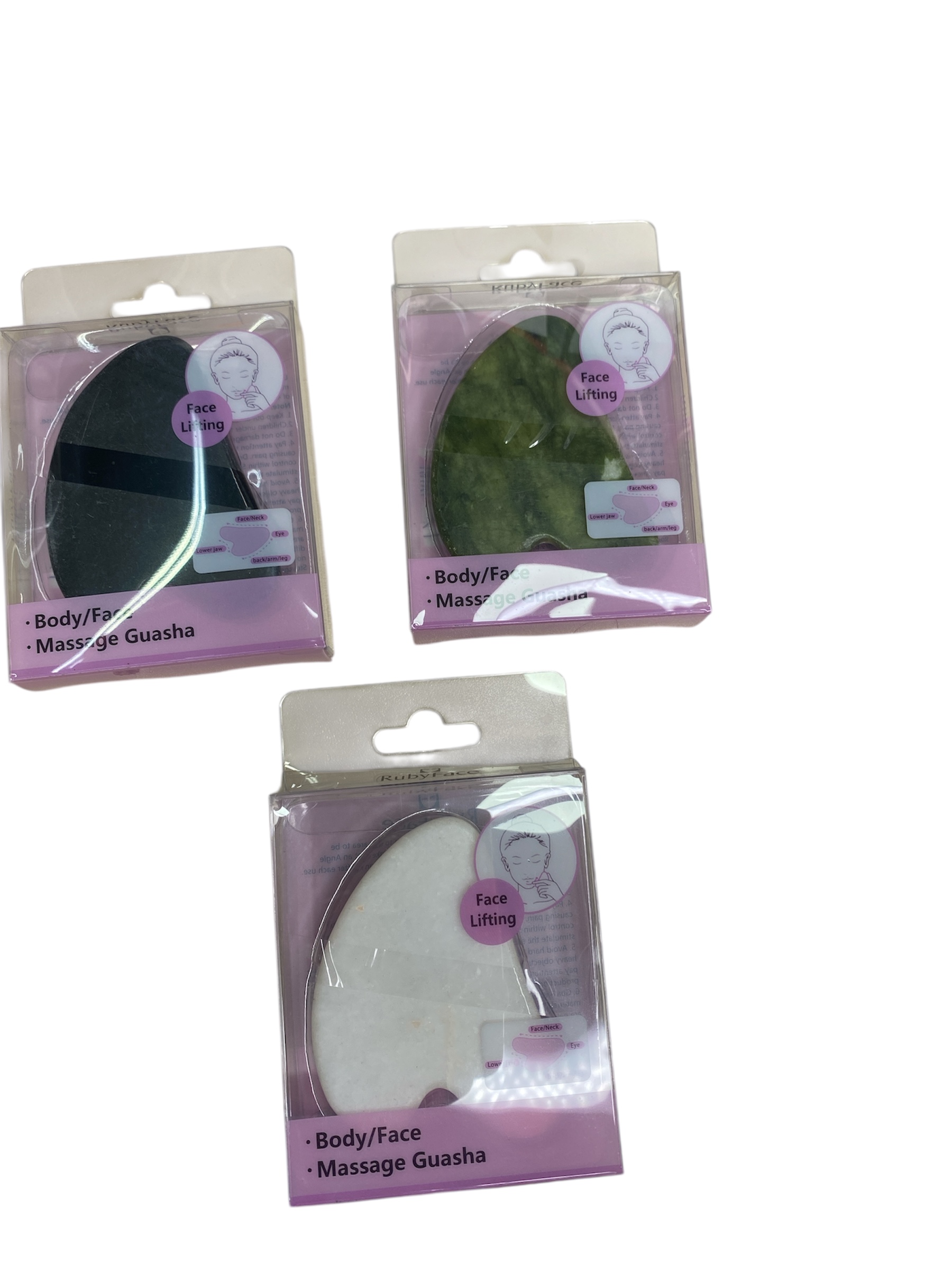Qué set tan lindo y efectivo! Las imágenes muestran una colección de herramientas Gua Sha (pronunciado «gua sha») de la marca RubyFace, herramientas tradicionales de la medicina china adaptadas para masaje facial y corporal moderno. El empaque es en tonos lila/morado con ilustraciones de uso y la frase «Body/Face Massage Guasha» junto a «Face Lifting», destacando su función principal: lifting facial, drenaje linfático y escultura de contornos.
