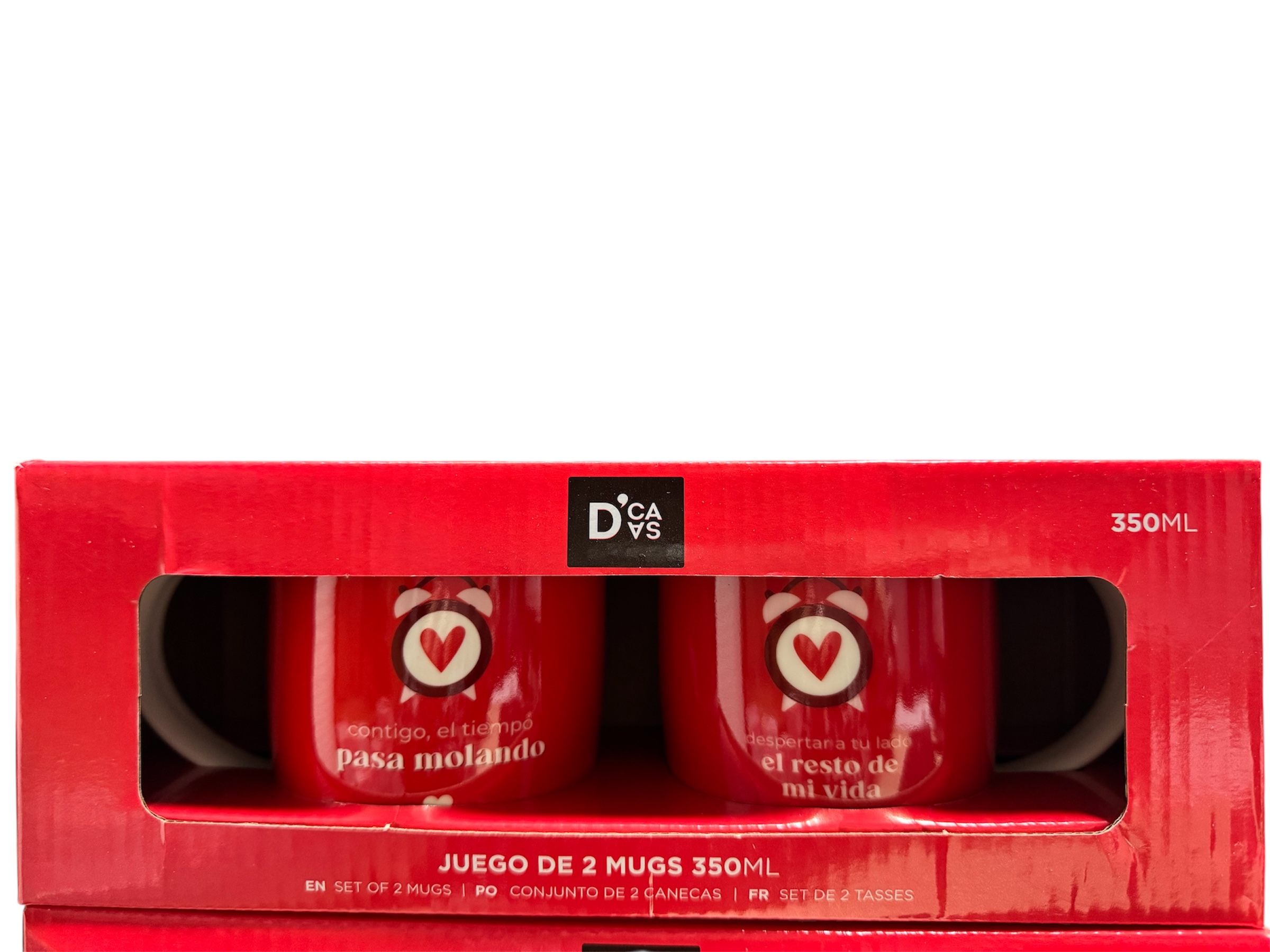 Vienen en una caja roja premium con ventana transparente que muestra las dos tazas lado a lado, como si ya estuvieran listas para compartir el primer café (o mate) de la mañana juntos. ¡Desde que lo ves, transmite calidez, compromiso y mucho amor!