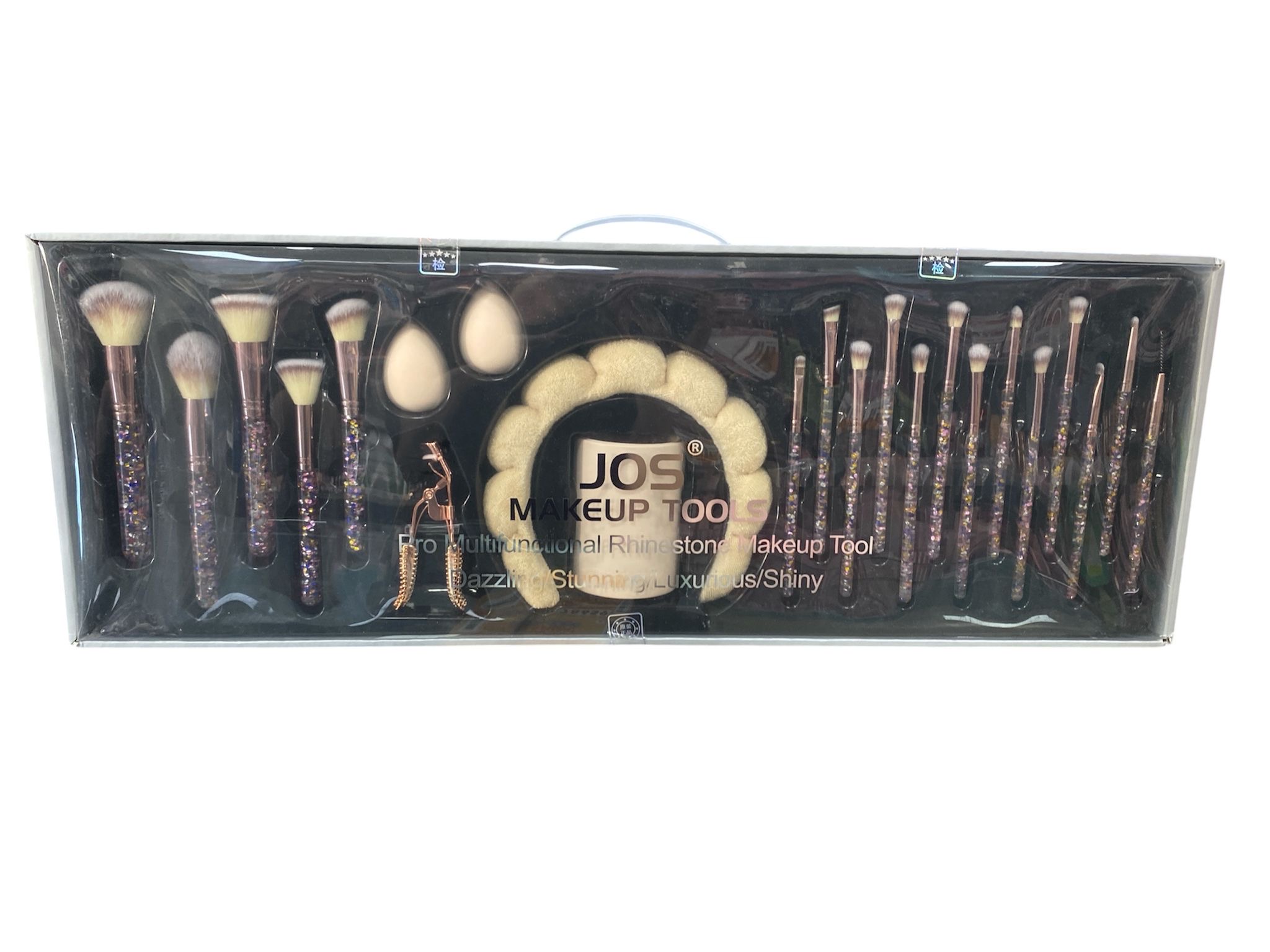 Este hermoso kit de 20 piezas está pensado para quienes aman el maquillaje con estilo y quieren destacar en cada detalle. Sus mangos cubiertos de rhinestones holográficos en tonos morados, dorados y arcoíris crean un efecto brillante y llamativo que hace que este set sea único y muy fotogénico.
