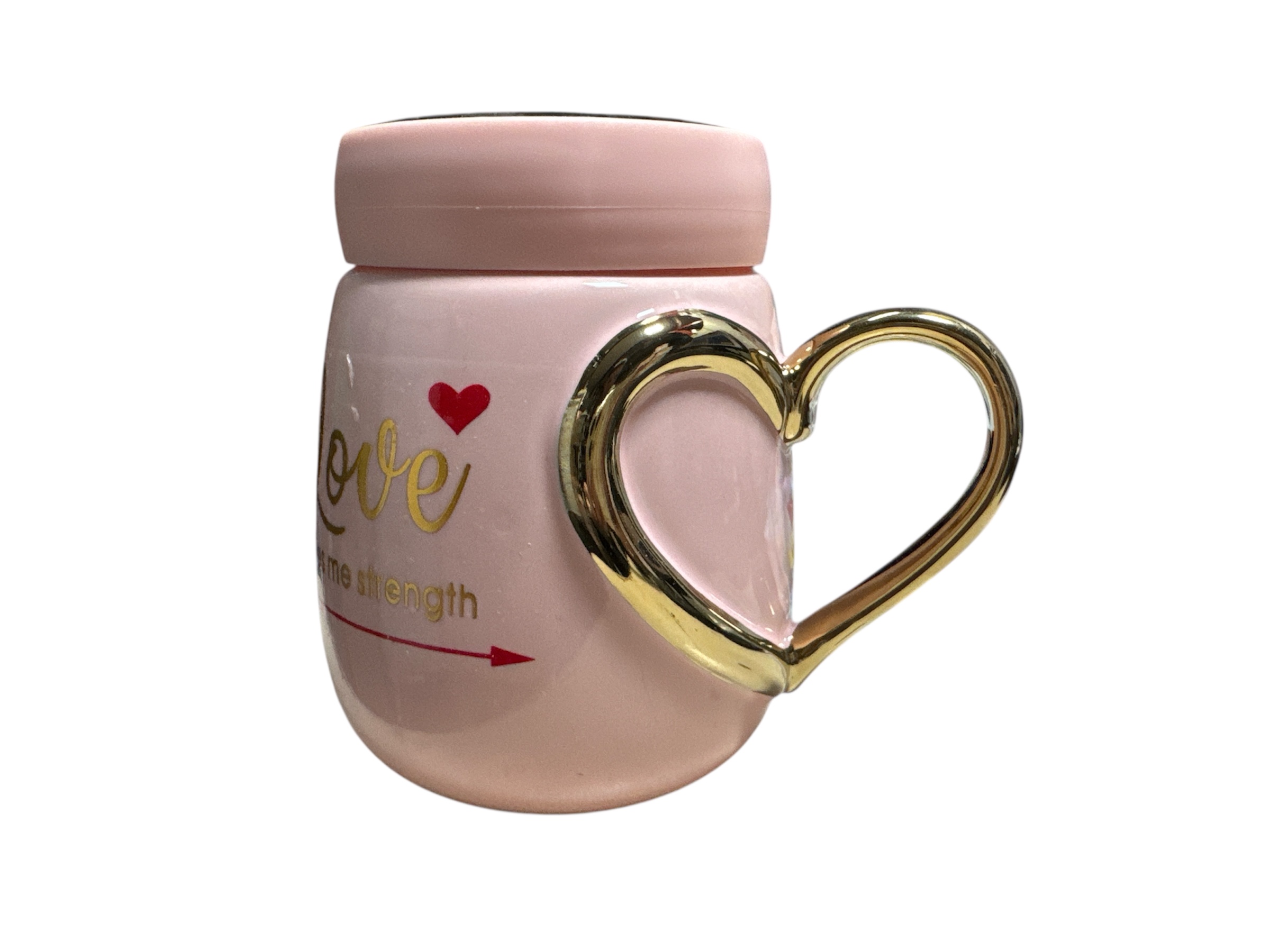 Taza rosa pastel con frase dorada «Love Gives Me Strength» (El amor me da fuerza), corazón rojo, flecha y asa metálica dorada brillante. Incluye tapa a juego. ¡Un recordatorio diario de que el amor nos hace más fuertes!