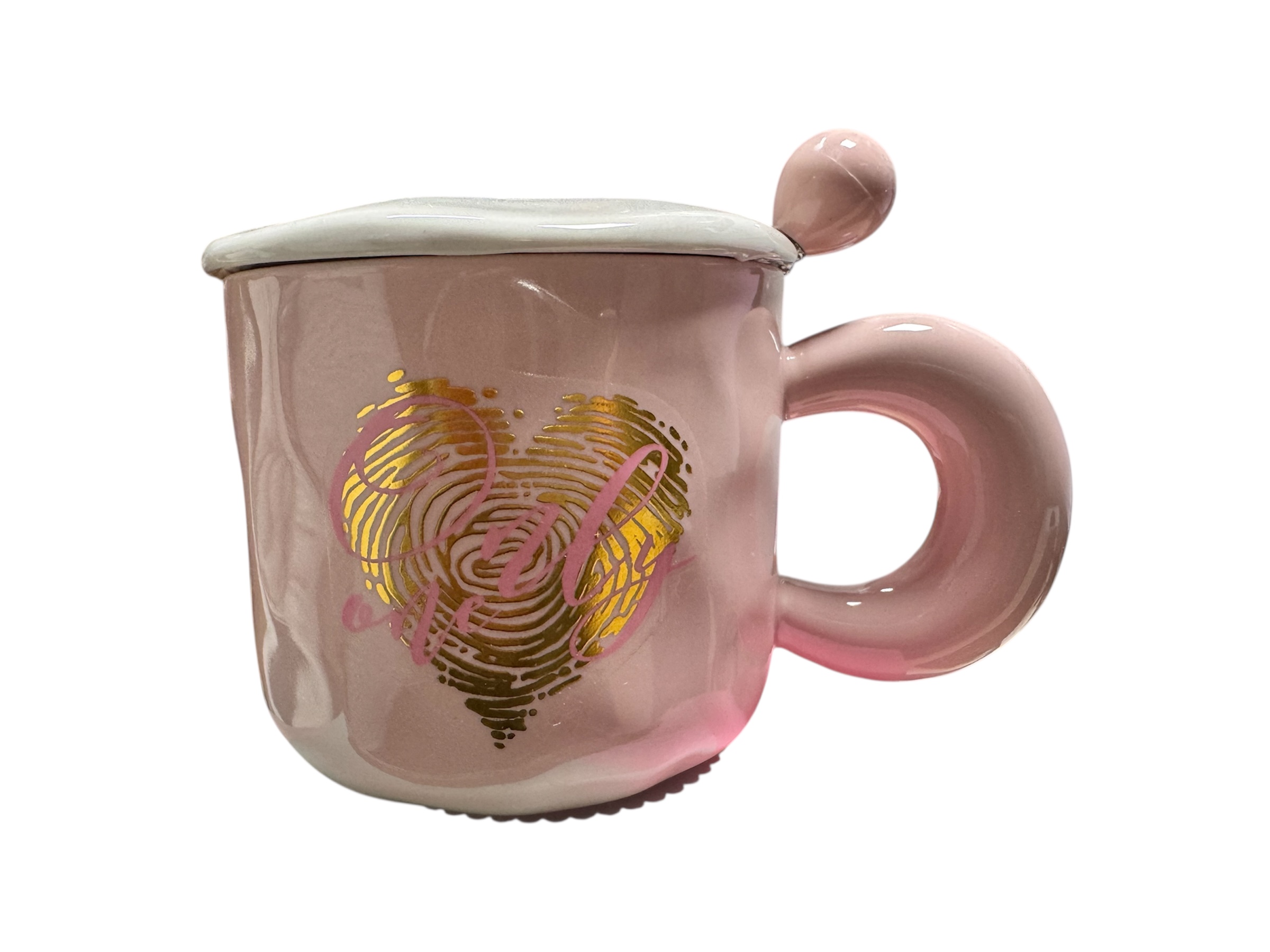 ¡Qué diseño tan original y lleno de significado! Esta taza es perfecta para expresar un amor exclusivo y personal, como si dejaras tu huella única en el corazón de esa persona especial. El protagonista es un gran corazón central con un efecto fingerprint (huella dactilar) en tonos dorados brillantes sobre fondo rosa suave, con la frase elegante «Only One» integrada en cursiva rosa y dorada, transmitiendo «solo tú» o «la única» de forma poética y moderna.