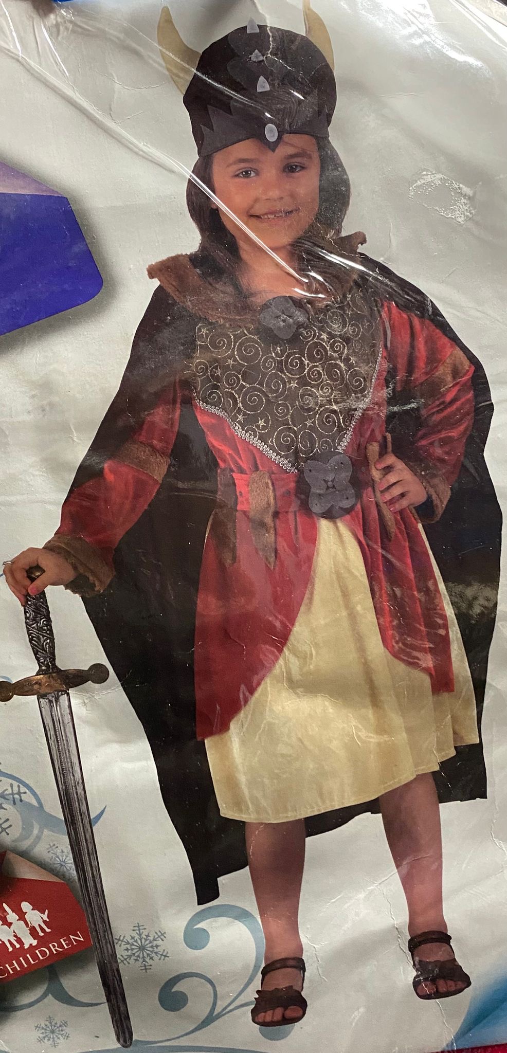 Está en excelente estado: usado solo una o dos veces (fiesta temática o Halloween), sin roturas, manchas ni desgaste en los cuernos o espada. Telas suaves y de calidad, colores intensos que destacan en fotos. Perfecto para disfraces de villanas, fantasía medieval, Game of Thrones kids vibe, carnaval, Halloween, actos escolares o fotos de book temático.