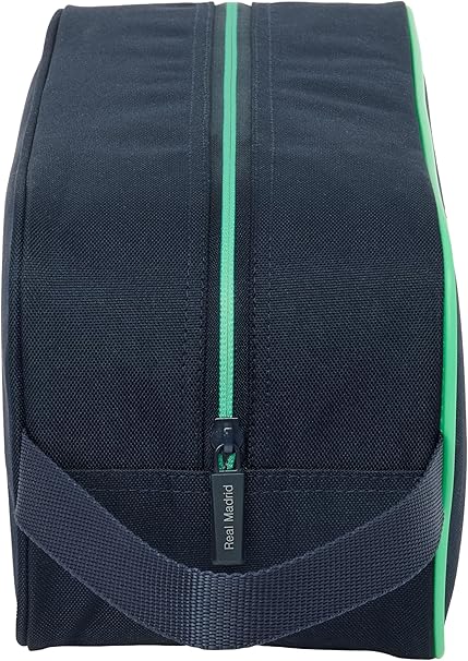 ¡Organiza tus esenciales con estilo madridista gracias a este neceser oficial del Real Madrid en azul marino con vibrantes detalles en verde neón!